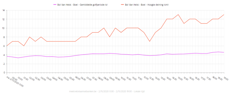 Van 8u tot 15u30 >1m. Van 10u15 tot 13u >1m40. En de piek van 11-12u met significante golfhoogte 1m70. Vanaf 12u zakt de golfhoogte snel in tot <1m om 15u30. Golfperiode gans de dag 4s.