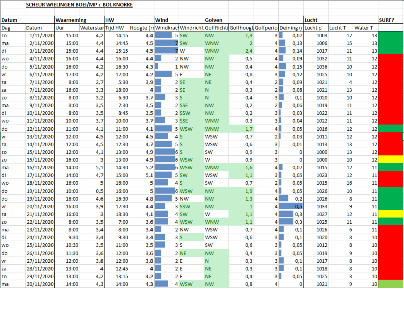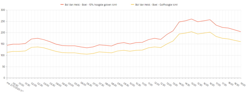 Het was mooi! Golfhoogtes gemeten tot 2m60 op bol van Heist. Van 14-16u golfhoogte 2m. Alleen zeer veel stroming naar het oosten toe - ik zat op een plek weinig beschutting tegen de wind - zelfs de golven kwamen er moeilijk door. Ideale plek in deze situatie: de oostkant van de haven van Cadzand. Alleen mogen we niet naar NL zonder quarantaine door corona, dus werd het Knokke. Vanaf 16u30 ideaal: stroomsnelheid was te doen en golven begonnen door te komen. Op de boeien om 16u30 nog steeds golfhoogtes van 2m gaande naar 1m70 om 18u. Golfperiode 4s en golfrichting uit W/WNW. Wind SW 6 naar 5.