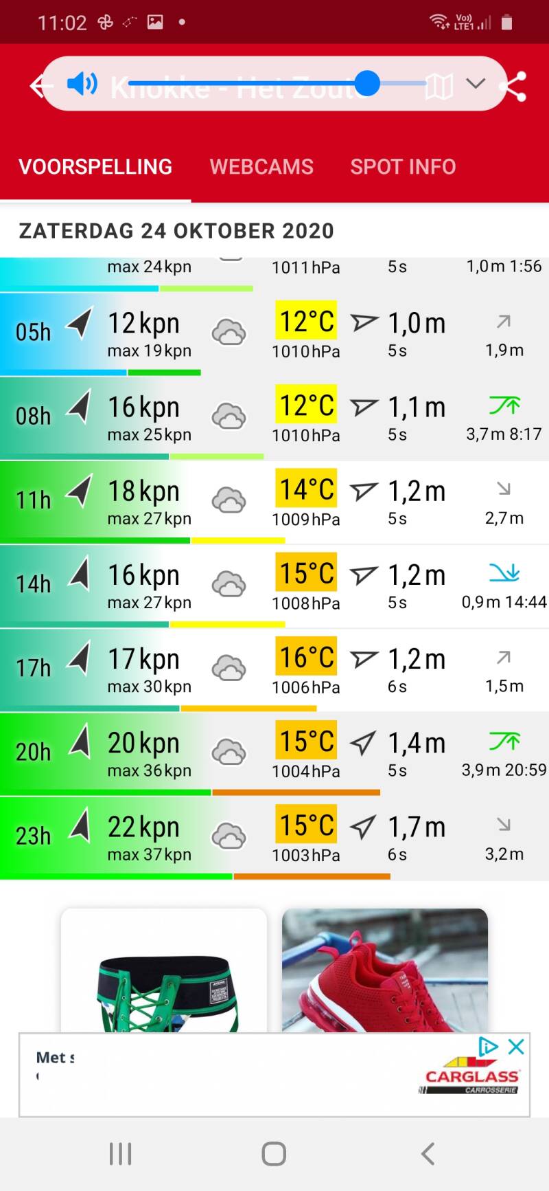 11u - Plat. Voorspelde golfhoogte 1,3m met periode van 6s. Voorspelde golfrichting is echter WSW. Getij 3u na HW. Wind SW 4-5.