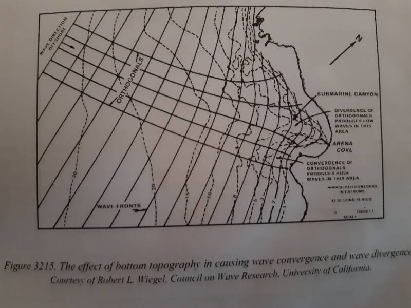 De golven zullen dus evenwijdig met de dieptelijnen mee de kust bereiken voordat ze breken. Denk aan een point break.