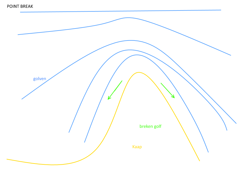 -point break: bij een nes of landtong (bv. denk aan een kaap): golven vertragen in ondiep water. Dit zorgt voor een lange mooie golf die links en rechts van de landtong breekt evenwijdig met de kust mee. Dan krijg je een golf die je heel lang kunt surfen. Zie tekening hierboven. Dit is eigenlijk de "ideale" situatie.