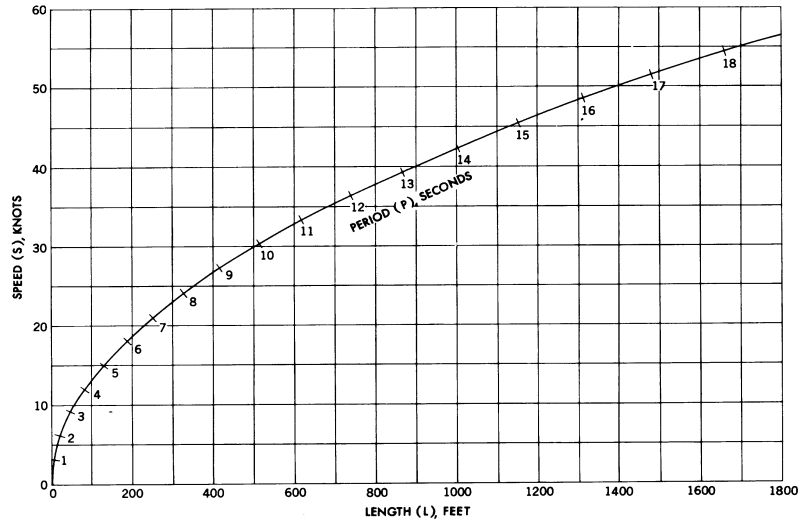 De golfperiode P (in s) hangt af van de golfsnelheid S (in knopen) en de golflengte L (in m):
