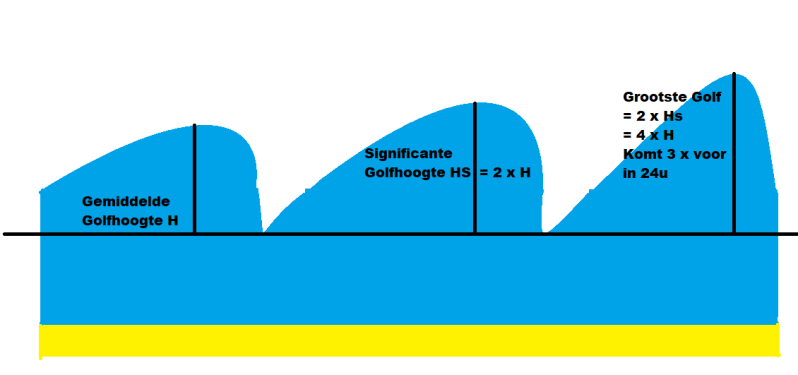 Dus bijvoorbeeld: stel de voorspelde golfhoogte om 13 tot 15u te Blankenberge = 1m. Dan zullen de meeste (gemiddelde) golven 0.67m hoog zijn. De 10% grootste golven 1m29 en de grootste golf 1m87.