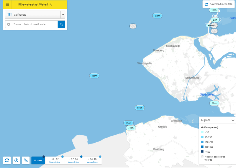 Data wordt gemeten op meetpalen en golfboeien. In Nederland en België zijn die alom aanwezig in de zee. De gegevens die zij meten zijn gratis beschikbaar online. Voor Nederland ga je naar de website van Rijkswaterstaat, voor België naar meetnet Vlaamse banken. Ik zit in de Oosthoek op de grensstreek en kijk op beide websites. De website van Rijkswaterstaat is iets gebruiksvriendelijker en overzichtelijker dan de Belgische variant en als er swell van de noord binnenkomt kunnen de Nederlandse boeien al een goeie indicatie geven van wat er komen zal hier op onze kust.